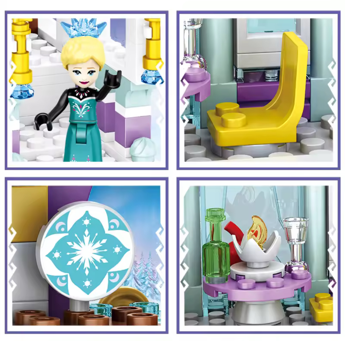 Śliczny pałac inspirowany zamkiem Elsy z filmu Kraina Lodu / Frozen. Zestaw składa się z 742 elementów. Zawiera klocki, figurki i instrukcje złożenia.