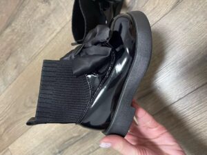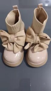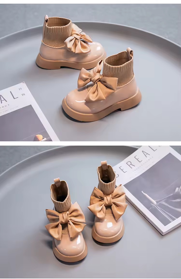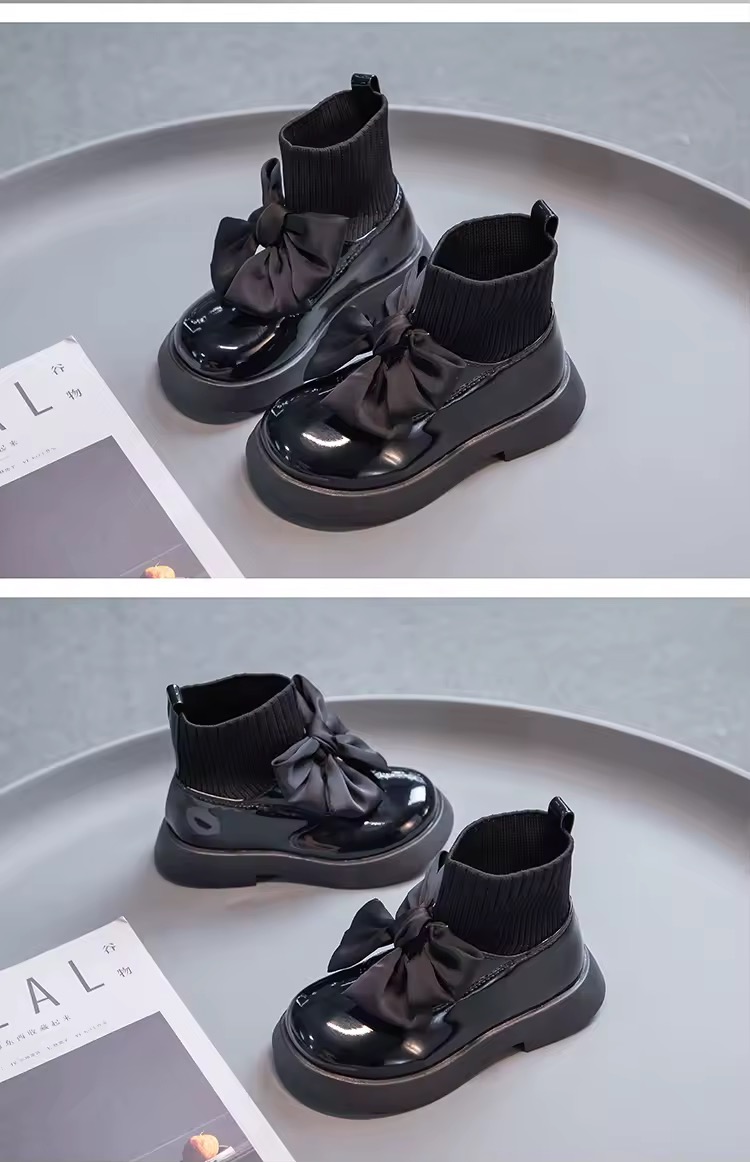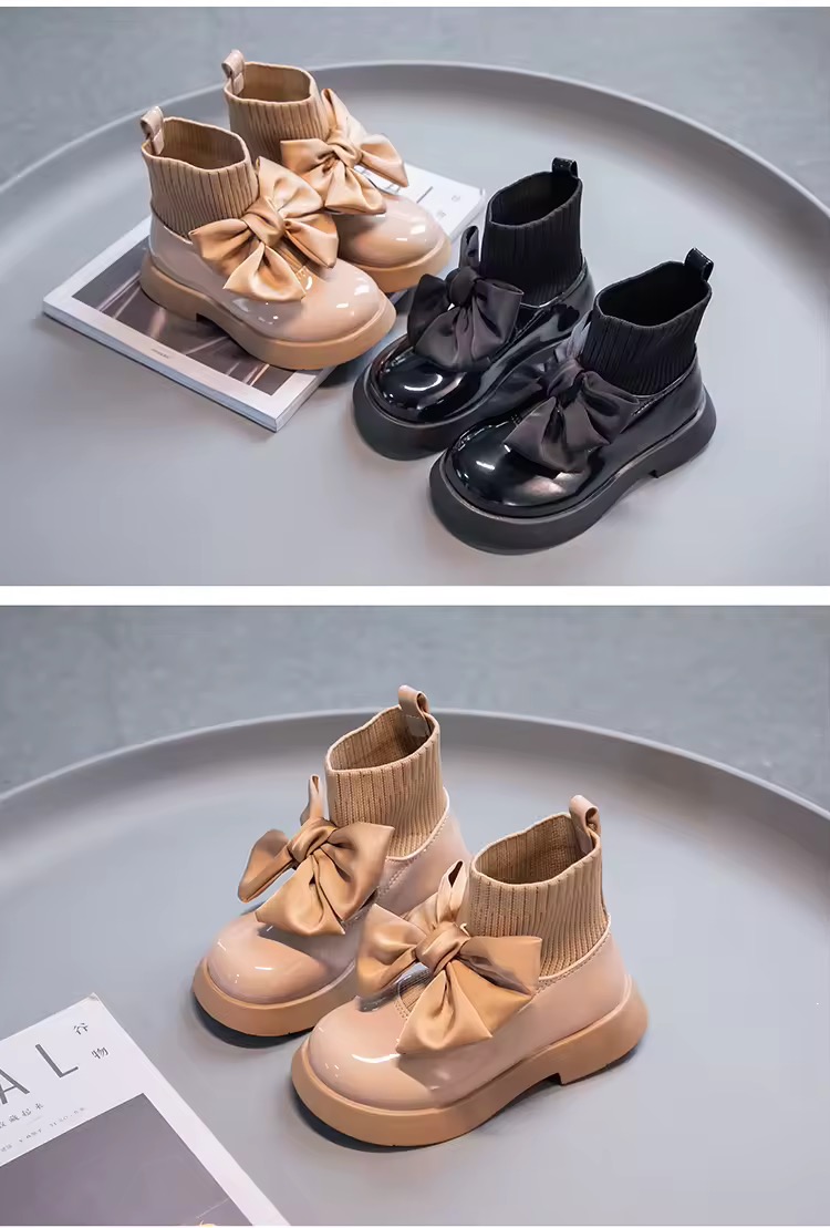 Urocze botki dla dziewczynki w stylu lordsów z dzianinową, elastyczną cholewką.