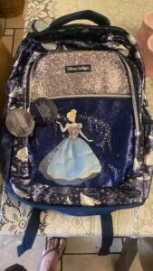 Solidny granatowy brokatowy plecak Kopciuszek dla dziewczynki. Ozdobiony aplikacja z Kopciuszkiem.