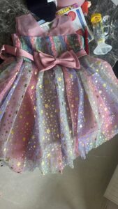 Na podszewce, wierzchnia warstwa z tiulu. Ozdobiona cekinami w kształcie gwiazdek i kokardką. Kolor pastelowy, tęczowy.