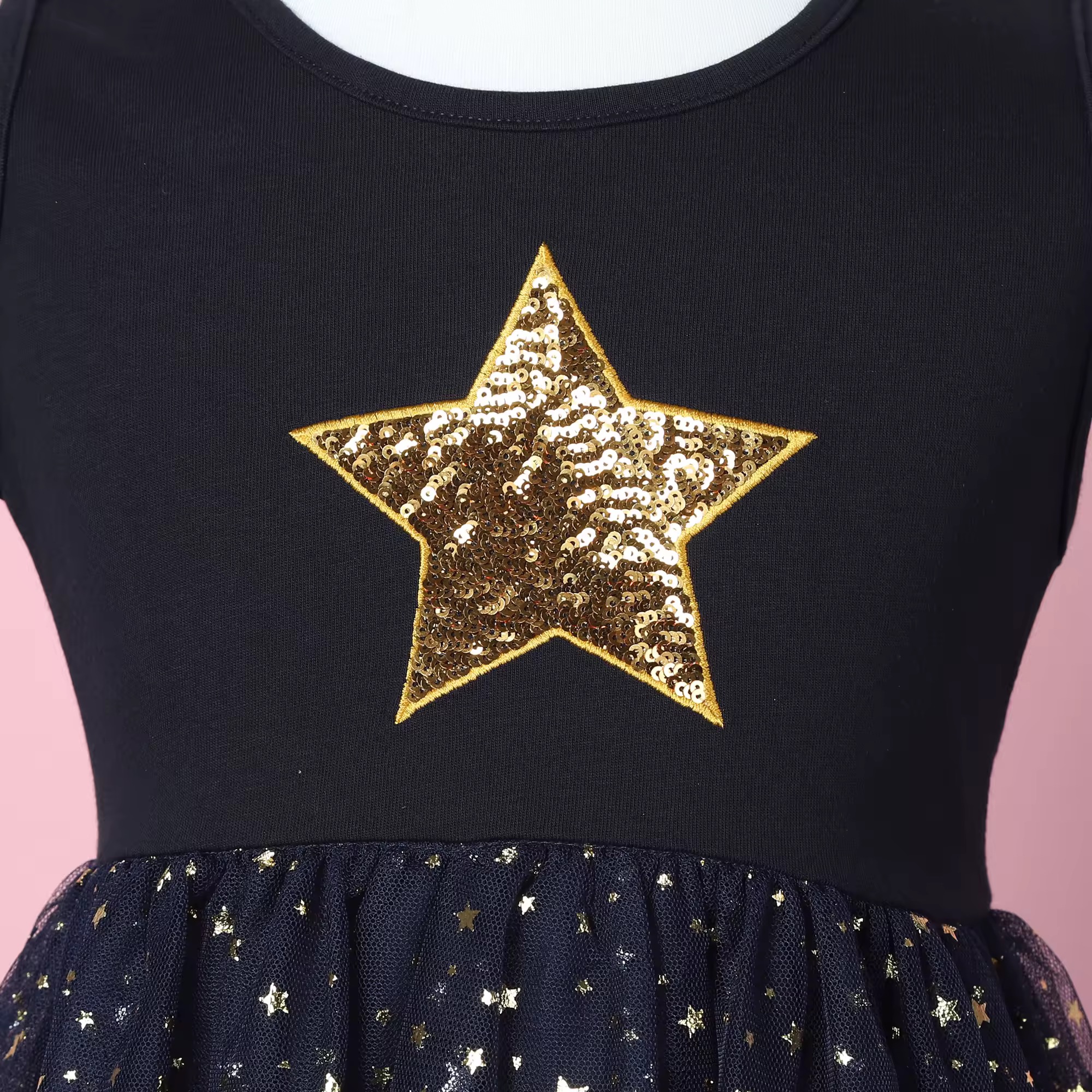 Góra sukienki wykonana ze 100% bawełny, czyli miłego dla ciała i oddychającego materiału. Z przodu cekinowa aplikacja w kształcie gwiazdy.